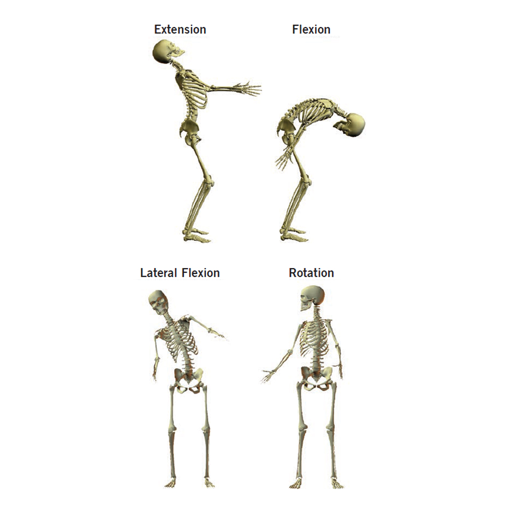 The vertebral column regions have varying ranges of movement of flexion, extension, lateral flexion and rotation as described in The Spine.