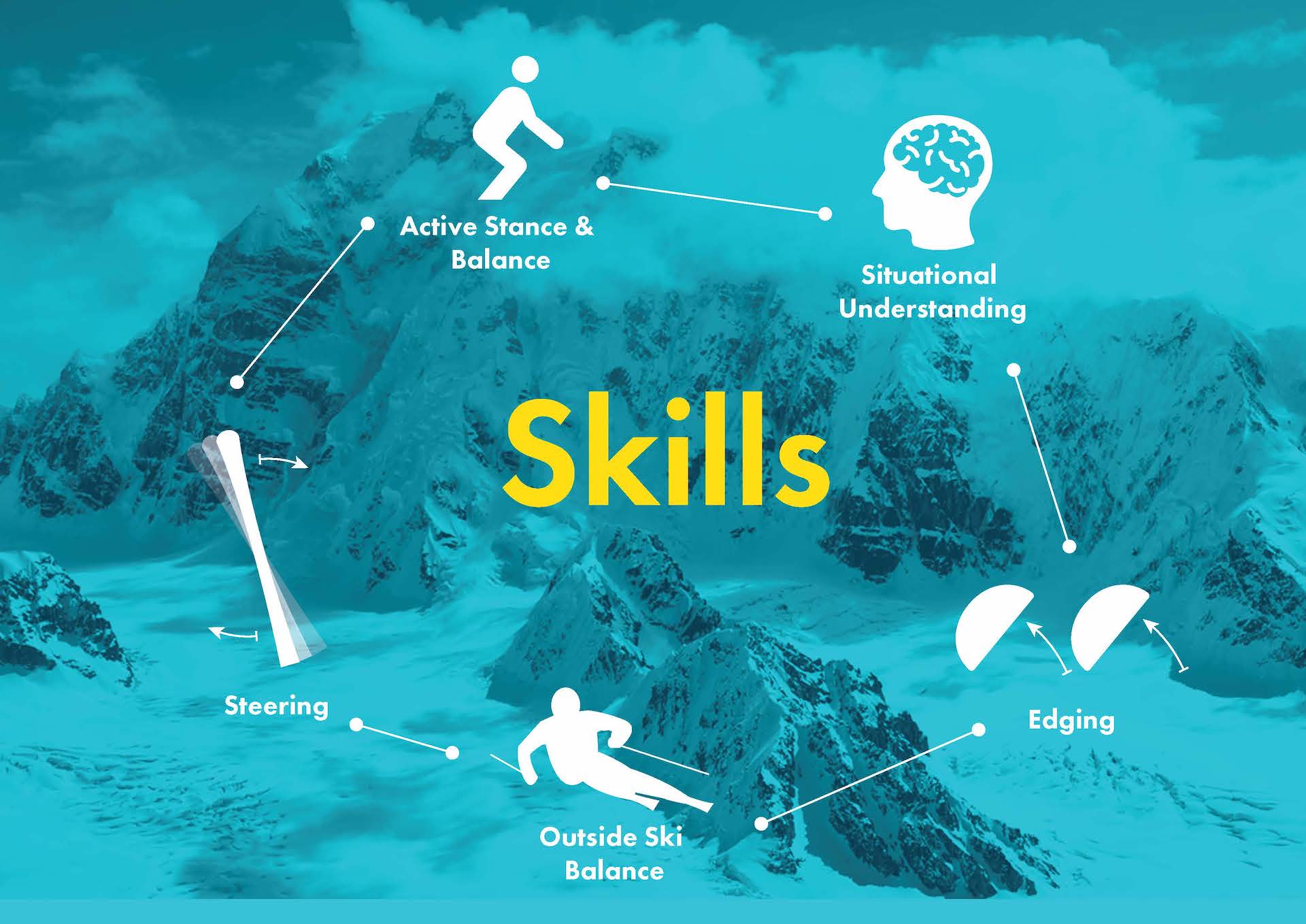 Skills for the NZISA is the combination of situational understanding and all 4 movements, linking the brain, body, and the skis to create skillful skiing.